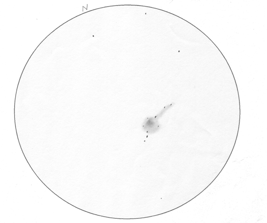 Maffei 1 visuell Jens Bohle Paolo Maffei entdeckte 1968 dieses Objekt im Sternbild Perseus am Schmidt-Teleskop des Asiago-Observatoriums bei der Suche nach T Tauri-Sternen und diffusen Nebeln. Durch die starke interstellare Extinktion in der sog. „Zone of Avoidance“ ist die Galaxie nicht gerade auffällig und zudem stark gerötet was zunächst die Vermutung aufkommen ließ, es handle sich bei dem diffusen Objekt um eine HII-Region. Die „Zone of Avoidance“ (wörtlich: “Zone der Vermeidung”) ist der Bereich des Himmels, welcher durch das Staubband der Milchstrasse abgeschirmt wird. Diese Abschirmung ist verantwortlich für die starke Lichtschwächung von Maffei 1 um fast 5 Magnituden im visuellen Spektralbereich. Im blauen Spektralbereich erhöht sich dieser Wert auf über 6 Magnituden! Mit einer absoluten Helligkeit von -21mag v zählt Maffei 1 aber zu den hellsten Galaxien am Nordhimmel! Wäre das Licht von Maffei 1 nicht so stark durch unsere Milchstrasse blockiert, wäre es fast ein Objekt für das bloße Auge, denn die Helligkeit würde etwa 6,5 mag visuell betragen. Auf jeden Fall wäre Maffei 1 ein Beobachtungsobjekt für kleine Optiken. Tatsächlich ist die etwa 10 Millionen Lichtjahre entfernte Galaxie Maffei 1 m. E. nicht mit kleinen Teleskopen zu beobachten. Problematisch ist die Beobachtung aufgrund der Tatsache, dass der Sternhaufen Czernik 11 genau in der Sichtlinie und somit vor der Galaxie steht. Beobachtungen mit kleineren Teleskopen (und Vergrößerungen) könnten dabei dessen unaufgelöste Sterne als ein diffuses Objekt (bzw. Maffei 1) vortäuschen. Meine Zeichnung zeigt genau diesen Effekt. Die diffusen Ausläufer sind vermutlich Sternketten von Czernik 11. Die rundlichen diffusen Bereiche zähle ich ebenfalls zum Sternhaufen. Die Galaxie selbst konnte ich nur in einem leicht aufgehellten Bereich im zentralen Teil des Haufens erkennen. Zum Einsatz kam ein 50cm-Teleskop. Ort der Beobachtung war Kärnten, Höhe etwa 2000 m. Grenzgröße im Zenit war besser als 7 mag. Neben Maffei 1 sind in der Nähe noch weitere schwache Galaxien der IC 342-Gruppe zu finden. Allerdings habe ich diese Objekte (Maffei 2 und Dwingeloo1) definitiv nicht gesehen. Dennoch lohnte sich ein Ausflug in die „Zone der Vermeidung“. Maffei 1 bei 107facher Vergrößerung am 50cm-Teleskop. Felddurchmesser ca. 36' |