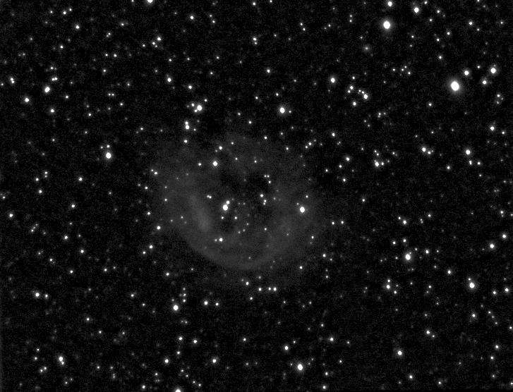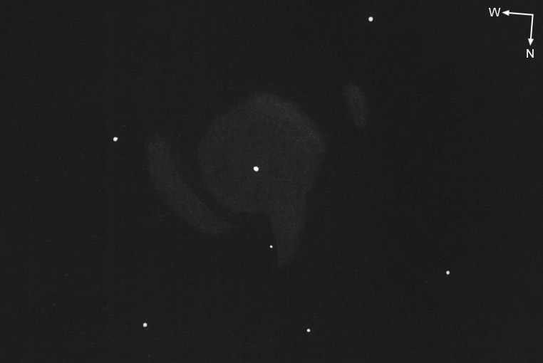 in Wettersberg bei Hersbruck etwa 30 km östlich von Nürnberg. Thomas Engl, 10“-SC bei fSt 6,6mag Bewaffnet mit dem 31er Nagler und O-III Filter machte ich mich auf die Suche. Nachdem das Zielgebiet identifiziert war, musste ich eingestehen, dass ich rein gar nichts sah. Nicht wesentlich besser sah es mit dem 56er Okular aus, aber zumindest der Hauch eines Halbringes konnte erkannt werden. Beste Beobachtung dann mit dem 40mm Okular: Sehr große, halbmondförmige Aufhellung, die mittels indirektem schauen aber sicher zu sehen ist; Strukturen oder ähnliches konnten nie sicher gesehen werden. Am ehesten würde ich noch eine dezente Aufhellung knapp westlich des Sternes GSC811 2166 (10,10mag) als gesehen gelten lassen. Diese zieht sich ca. 3 Bogenminuten nach Süden, wo sie sich auch schnell wieder verliert. Insgesamt aber eine sehr vage Beobachtung am Rand der „Legalität“. |
