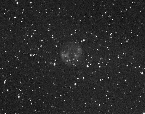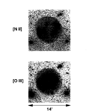 Abell 7: Ein weiterer PN aus dem 1955 erschienenen Abell-Katalog. Dieses etwa 20 000 Jahre alte Objekt dürfte dem visuellen Beobachter aufgrund seiner ausgeprägten [OIII]-Linie sehr entgegen kommen. A 7 zeigt sich als nahezu runder PN. Etwas schwächer, aber sehr ähnlich, sieht A 7 in der [NII]-Linie aus. Abell 7 ist etwa 930pc von uns entfernt und besitzt einen etwa 110 000 ° K heißen Zentralstern. Bei diesem Nebel konnte bislang keine Wechselwirkung mit dem interstellaren Medium erkannt werden. Die auf den [NII]-Aufnahmen sichtbaren Verdichtungen innerhalb des PN ließ zwar zunächst die Vermutung zu, dass es sich um in Sichtlinie gelegene Strukturen, also perspektivisch gesehen auf uns gerichtete Knoten/ Verdichtungen handelt und diese nicht innerhalb sondern außerhalb des PN liegen. Dies könnte ein Hinweis auf Wechselwirkung mit dem interstellaren Medium sein. Jedoch wurde diese Vermutung wieder verworfen. Diese Aufnahme stammt aus dem „Atlas of ancient planetary nebulae and their interaction with the interstellar medium„ von TWEEDY R.W., KWITTER K.B.. Erkennbar hier die relativ starke O[III]-Emission. Diese am 15. Februar 2004 entstandenen Aufnahme stammt von Rick Schrantz. Rick belichtete 1 Stunde bei Blende 2.8 mit dem Nikon 300mm Teleobjektiv mit vorgeschaltetem H alpha-Filter an seiner ST10-XME CCD-Kamera. Visuelle Beobachtung: Stathis Kafalis, 255/1380mm Newton, fst 6,3 mag 58fache Vergrößerung bei 1,1° Gesichtsfeld und 4,4mmAP. [OIII] + o. Filter. Ohne Filter Sternknäuel ca. 5 Sterne 11-13mag. Mit O[III] sehr, sehr schwaches diffuses Glow von ca. 8' Durchmesser drumherum? Oder Streuen nur die Sterne durch den Filter? |