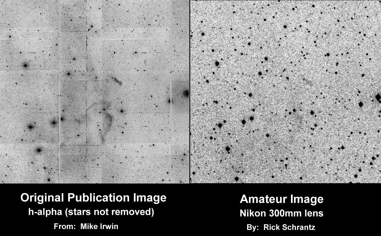 Hewett 1: Die Entdeckung des bislang größte Planetarische Nebel wurde im November 2003 von Paul C. Hewett und seinen Mitarbeitern bekannt gegeben. Aufnahmen des Sloan Digital Sky Survey zeigten eindeutig eine nebulöse Strukturen Der nur etwa 155pc (+ - 50pc) entfernte DO-Zwergstern PG 1034+001 kommt als Zentralstern in Frage. Somit dürfte Hewett 1 der nächste oder zumindest der zweitnächste PN sein (nach Sh 2-216 mit etwa 130pc). Seine tatsächliche Größe beträgt damit minimal 3,5 pc. Falls der Wert 100pc als Entfernung zutrifft, sogar 7pc. Neben MWP 1 und Sh 2-216 reiht sich Hewett 1 in die Riege der sehr großen PN ein. Drei Monate nach der Entdeckung berichten Thomas Rauch, Florian Kerber und E. M. Pauli von einem Halo um den PN welcher auf den SHASSA entdeckt wurde. Die Ausdehnung des elliptischen Shells beträgt 6° * 9°! Ein weiterer umgebender, allerdings viel schwächerer Halo, misst bis zu 10° im Durchmesser. Ob es sich dabei um Material des Zwergsterns oder um angeregte interstellare Materie handelt ist noch nicht klar. Neuere Untersuchungen belegen allerdings, dass es sich bei Hewett 1 doch nicht um einen PN handeln könnte. Diese Aufnahme von Rick Schrantz zeigt Hewett 1 sehr deutlich in der O[III]-Linie. Hier kam seine ST10-XME-Kamera mit O[III]-Filter an einem 300mm Nikon Teleobjektiv bei f/2.8 zum Einsatz. Belichtet wurde 6mal a 15 Minuten. Hier sehen wir eine direkte Gegenüberstellung der Aufnahme aus der Arbeit von Hewett und Irwin und der Amateuraufnahme von Rick Schrantz. Rick benutze auch hier eine ST10-XME Kamera mit CS H alpha-Filter an einem 300mm Nikon Teleobjektiv bei f/2.8 und belichtete 4 x 15 Minuten. Die Aufnahme ist ein Ausschnitt des unteren Bildes. Diese Übersichtsaufnahme stammt ebenfalls von Rick Schrantz und zeigt die weitere nebulöse Gebiete in nordwestlichen Bildausschnitt. Dies könnte ein Teil des später von Thomas Rauch, Florian Kerber und E. M. Pauli entdeckten elliptischen Halos um Hewett 1 sein. Hier sehen wir eine weitere Aufnahme von