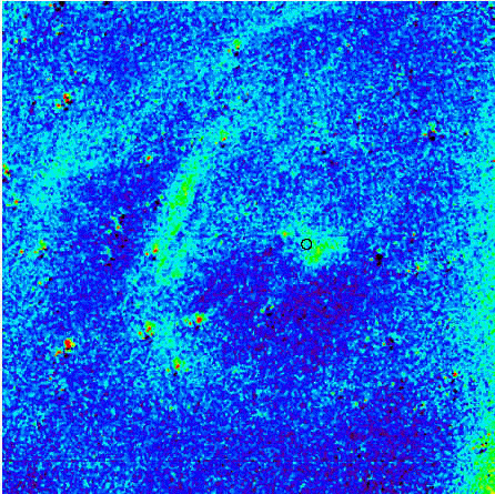 Rick Schrantz welche mit einem 50 mm f/1.4 Zum Vergleich eine SHASSA-Aufnahme aus der Arbeit von Thomas Rauch, Florian Kerber und E. M. Pauli welche die Strukturen um den eigentlichen PN zeigen. Der Kreis markiert den vermutlichen Zentralstern PG 1034+001. Der Bildausschnitt misst 13°.