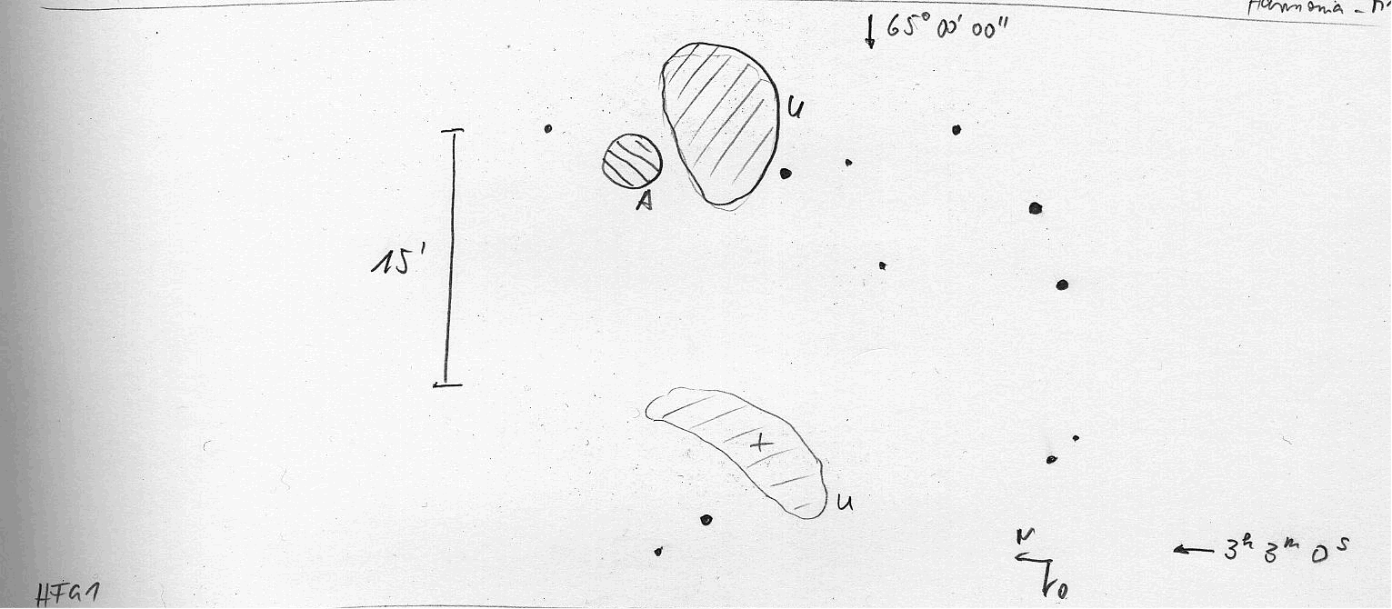 Visuelle Beobachtung: Uwe Pilz, 320/1440mm Newton, Bortle 4-5, 45facheVergrößerung (7mm AP) bei 1,2° Gesichtsfeld. Ein Filament auf der Katalogposition, sichelförmig, nach Osten geöffnet. Ein Filament 15' westlich der Katalogposition, eher rund. Angelika Gruner, 320/1440mm Newton, Bortle 4-5, 45facheVergrößerung ( 7mm AP) bei 1,2° Gesichtsfeld. Ein Filament 15' westlich und etwas nördlich der Katalogposition, knapp nördlich neben Uwes Sichtung. Rund. Skizze zur Sichtung |