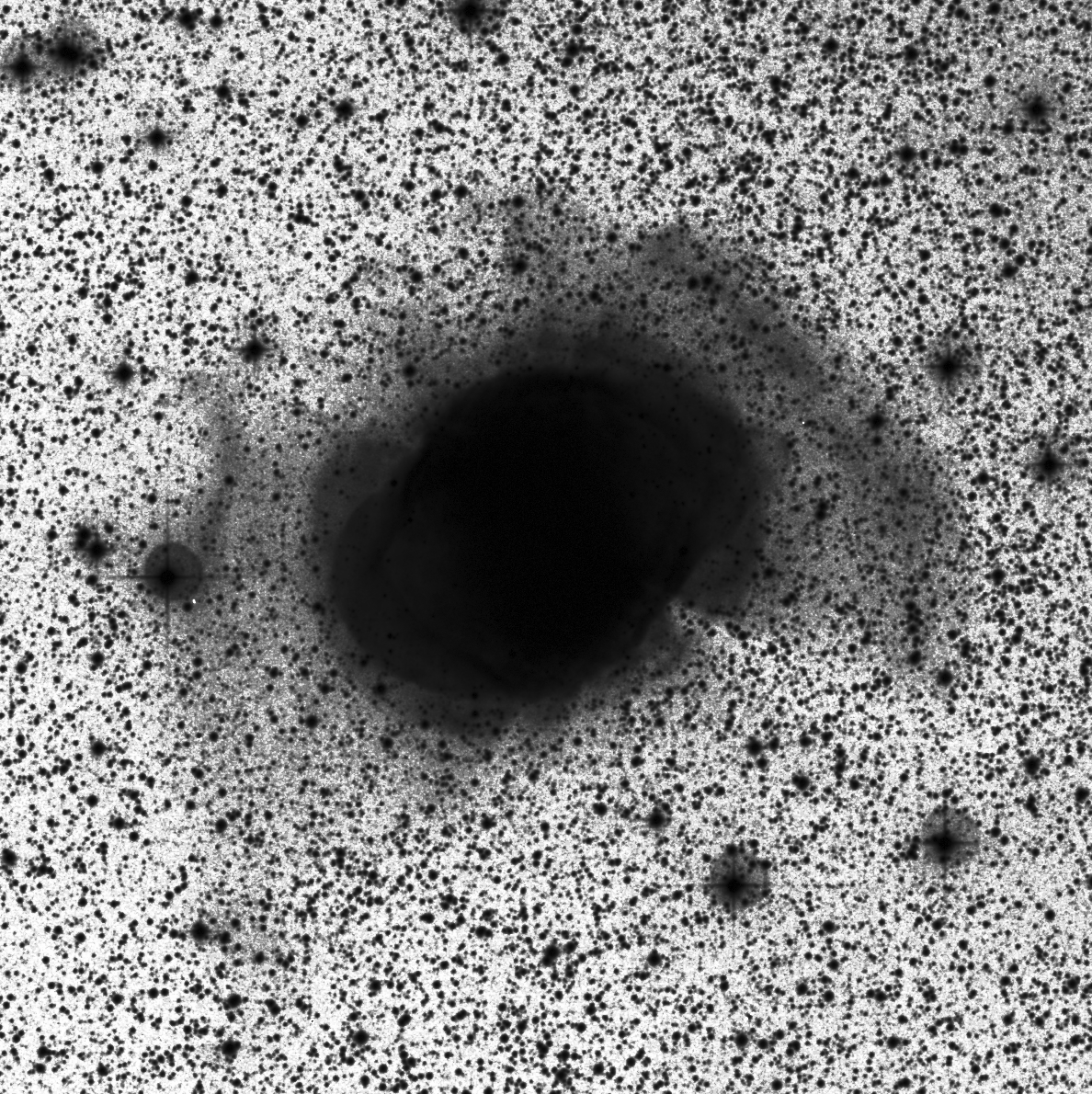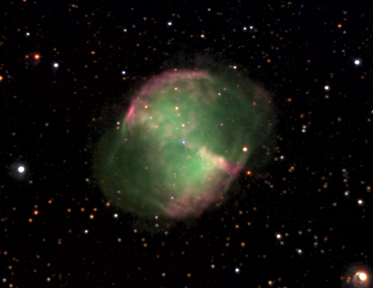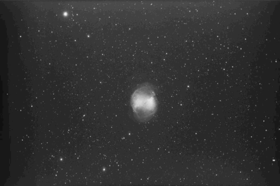 Visuelle Beobachtung: Jens Bohle 508/2250mm, fst 6,5 mag Pol, 64fache bis 107fache Vergrößerung (8mm- 5mmAP) [OIII] + o. Filter. Nebel sehr hell und nahezu rund. Halostrukturen im östlichen Bereich außerhalb des Nebels zu erkennen. Diese sind mit Filter nicht besser zu erkennen! Zs und weitere Sterne deutlich. Stathis Kafalis, 10 x 50 Fernglas 5 mag Pol, 5mm AP, Kleiner runder heller Fleck Stathis Kafalis, 155/880 mm Newton, fst, 7 mag Spitzendurchsicht Olymp in Griechenland, 150fache Vergrößerung bei 2,9mm AP o. Filter, riesengroße, extrem helle Hantel mit Gekrusel. Äquatoriale "Ohren" bis in die letzten Ausläufer ohne Filter sichtbar. Kein Zentralstern. |