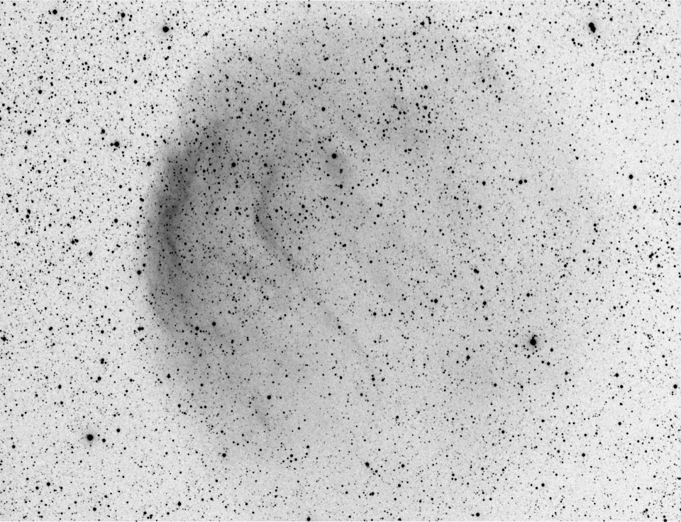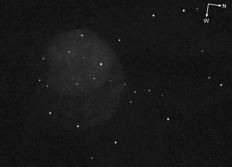 Visuelle Beobachtung: Martin Schönball (Daten siehe Zeichnung). Sehr großer, sehr schwacher Nebel. Ostseite ist schärfer begrenzt, die hellsten Teile erscheinen erst oval etwa N-S, dann aber fast rund. Im NO befindet sich der hellste Teil, der etwa 2/3 der Gesamtfläche ausmacht. Ohne [OIII] Filter nicht zu sehen. Zeichnung angefertigt. |