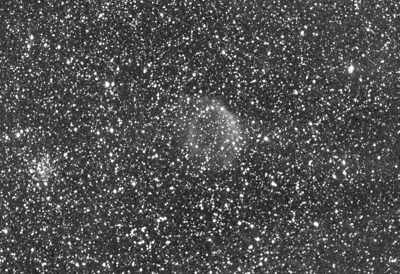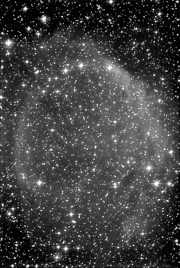 K.B.) Der PN in zwei Spektralbereichen aus dem „Atlas of ancient planetary nebulae and their interaction with the interstellar medium„ von TWEEDY R.W., KWITTER K.B.. Diese Aufnahme zeigt den PN nach 4* 15 Minuten Belichtungszeit durch 300mm f/2.8 Teleobjektiv + Halpha-Filter. Bildautor: Rick Schrantz Mit wesentlich größerem Equipment, einem 60 cm Hypergraphen bei f/ 3, belichteten Ernst von Voigt und Dietmar Böcker den PN. Belichtungszeit H-alpha 120 min (24x300 sec); 2*2 Binning mit einer ST-10 XME.
